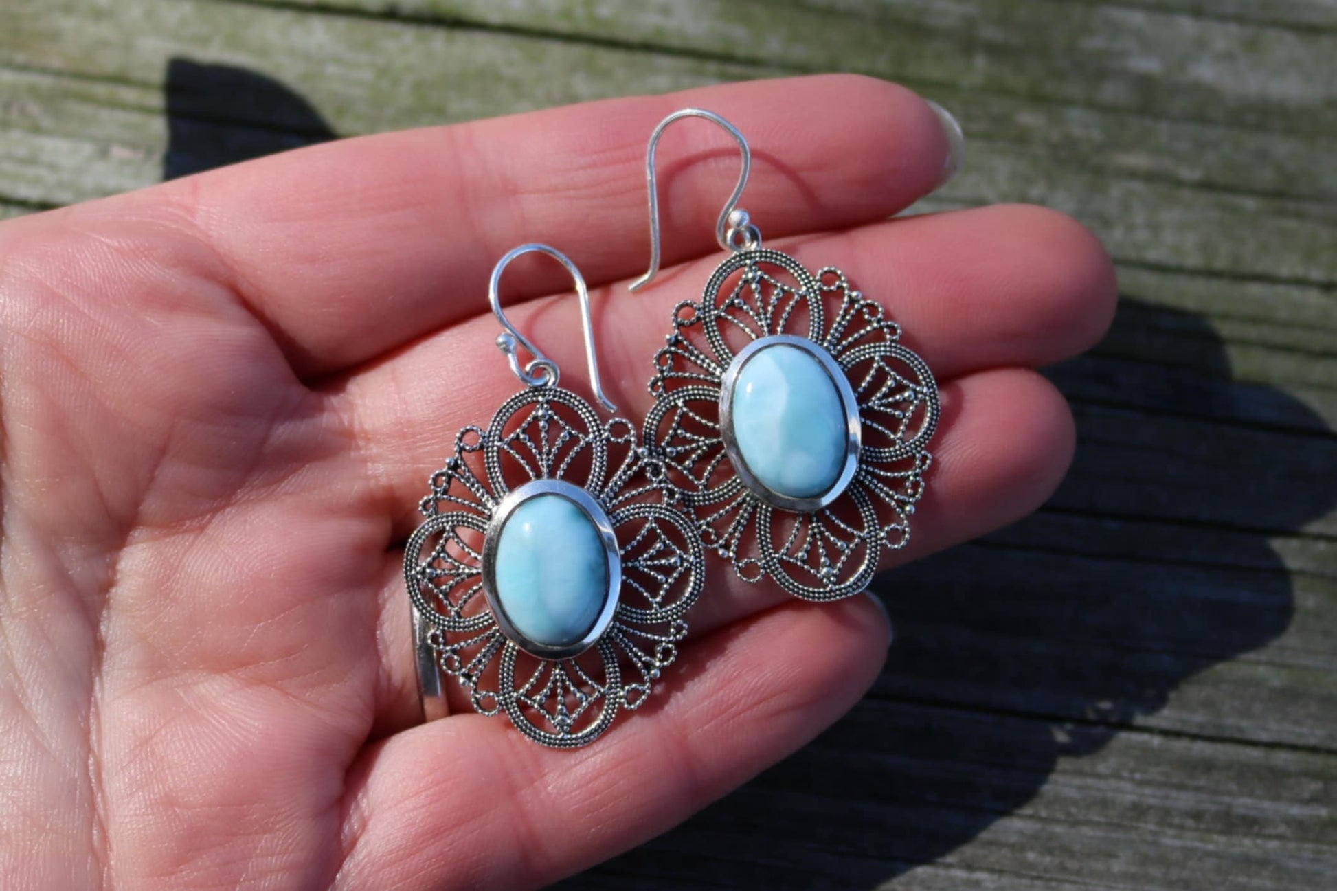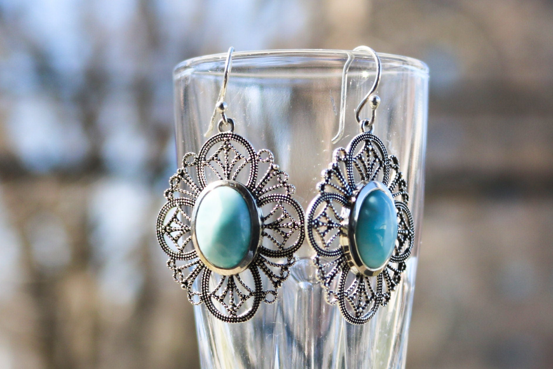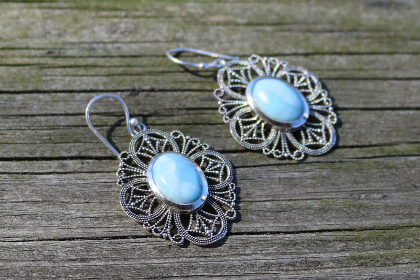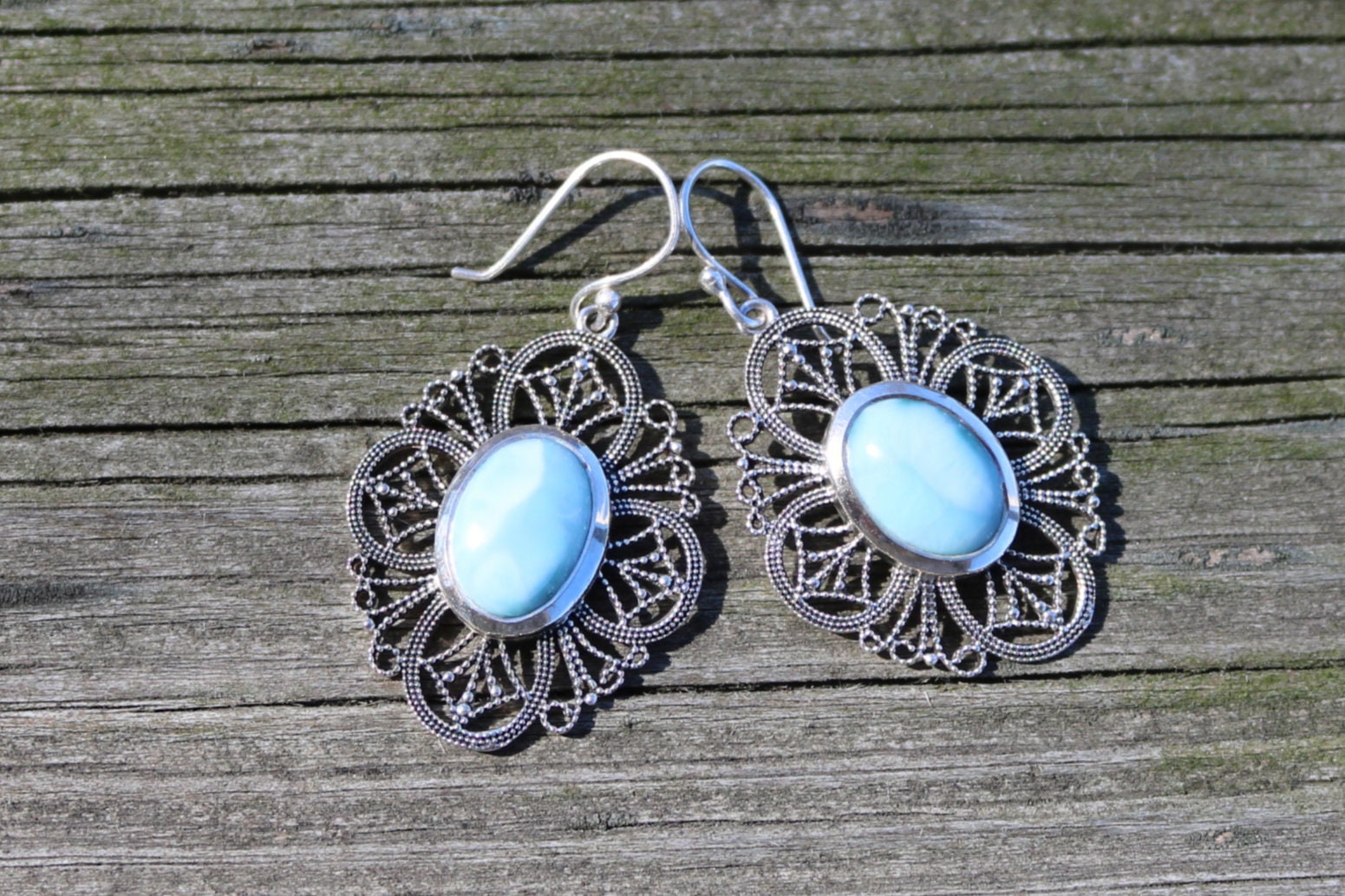 Larimar Earrings Dangling Filigree Ocean Summer Jewelry 1.83" 925 Silver