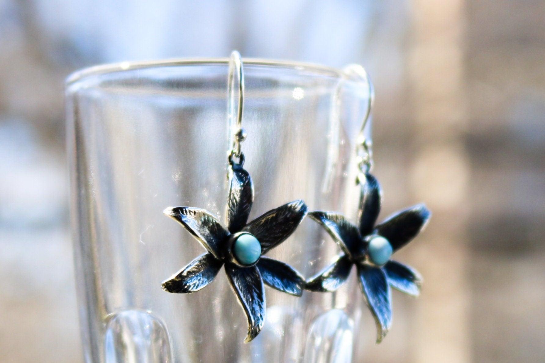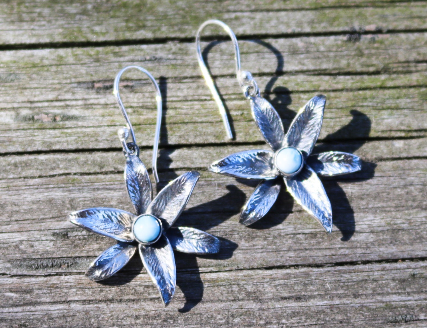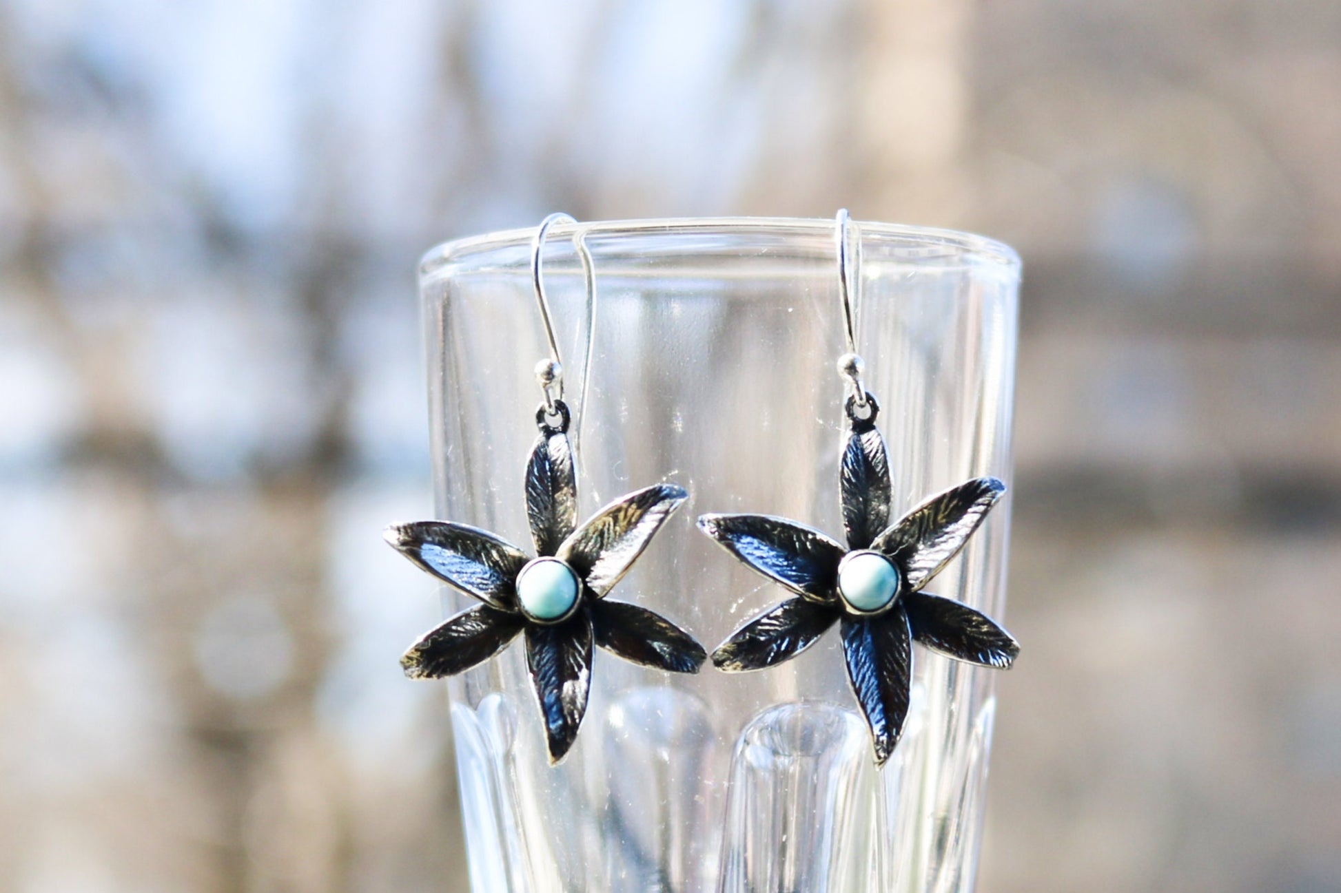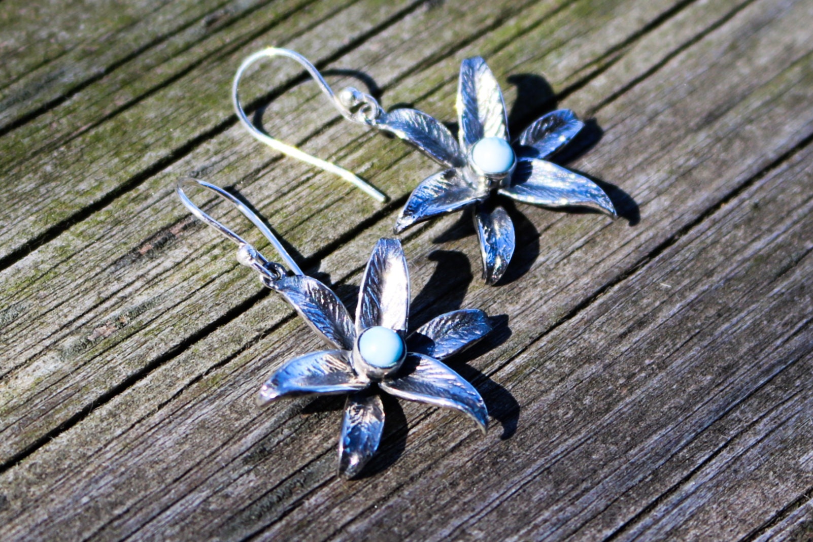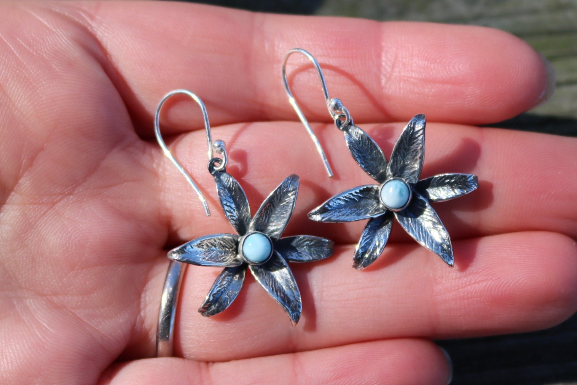 Larimar Earrings Dangling Flower Ocean Summer Jewelry 1.6" 925 Silver