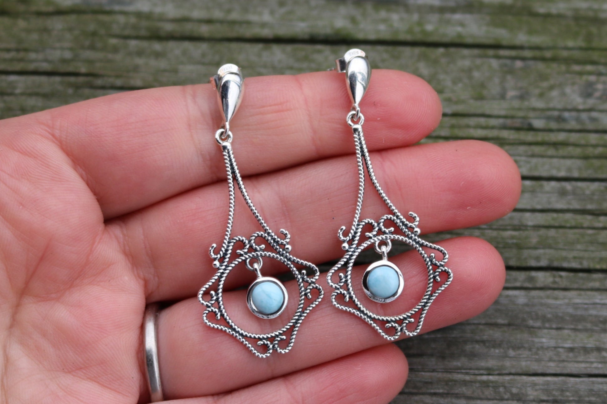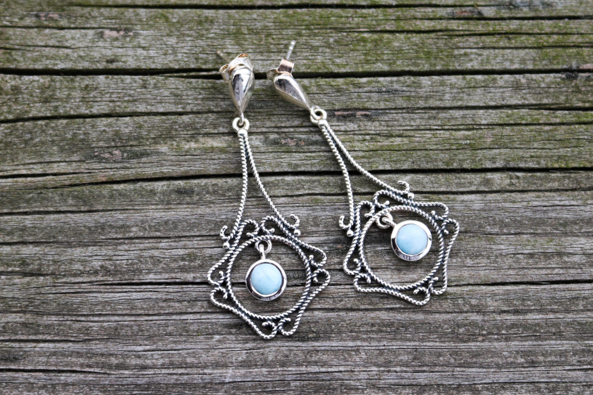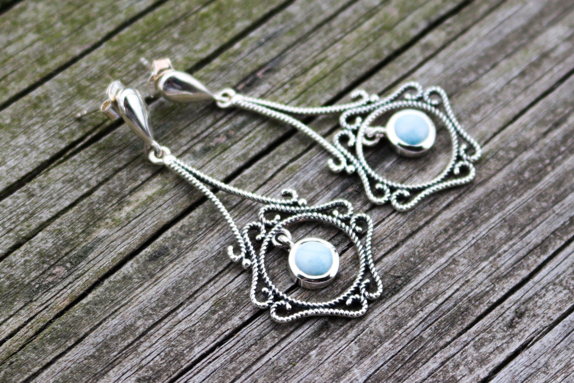 Larimar Earrings Leaf Dangling Filigree Ocean Summer Jewelry 2" 925 Silver