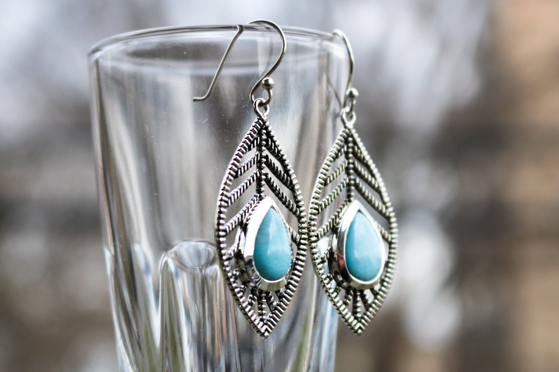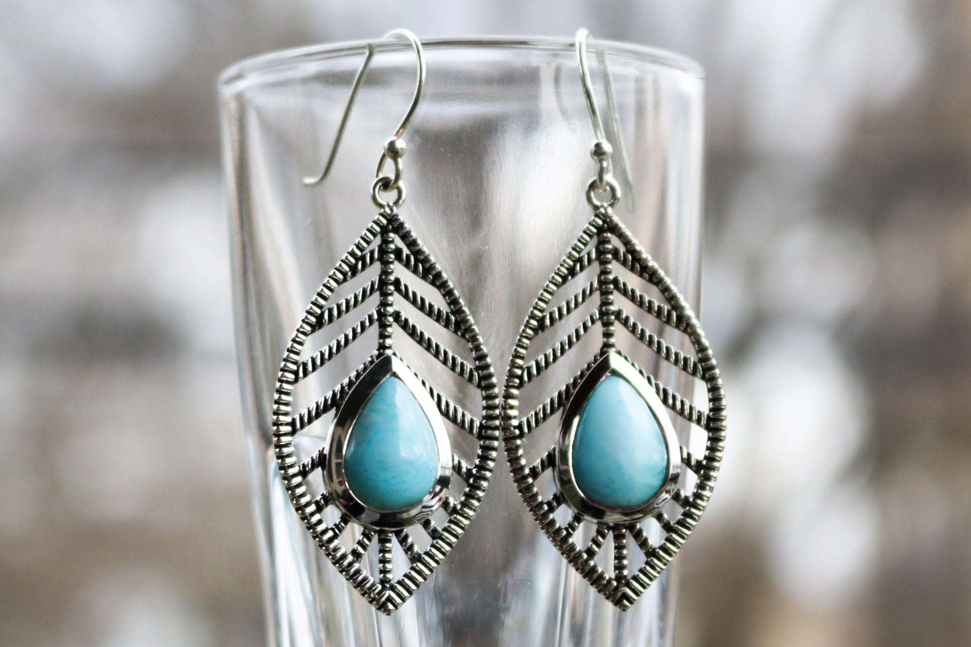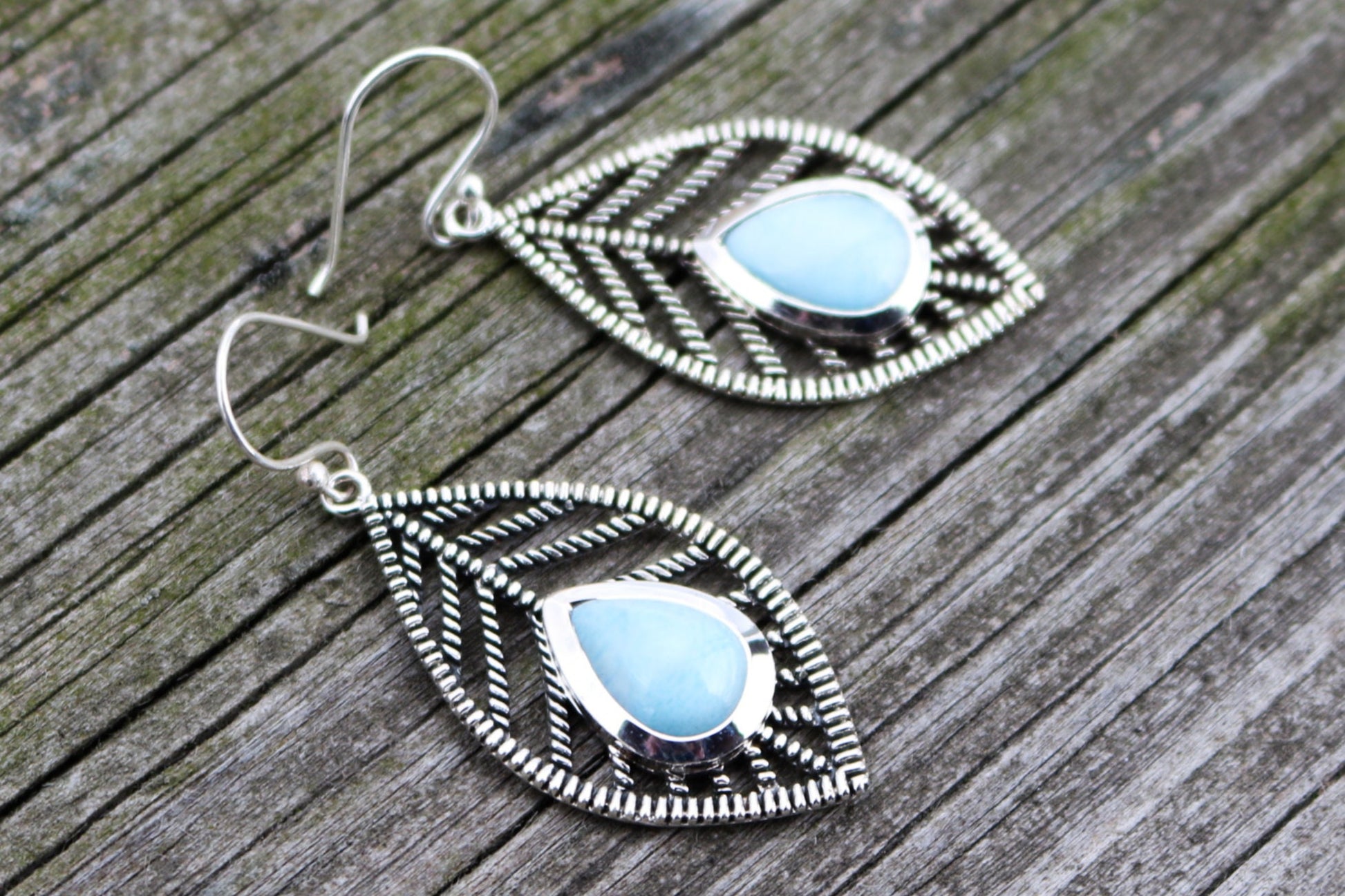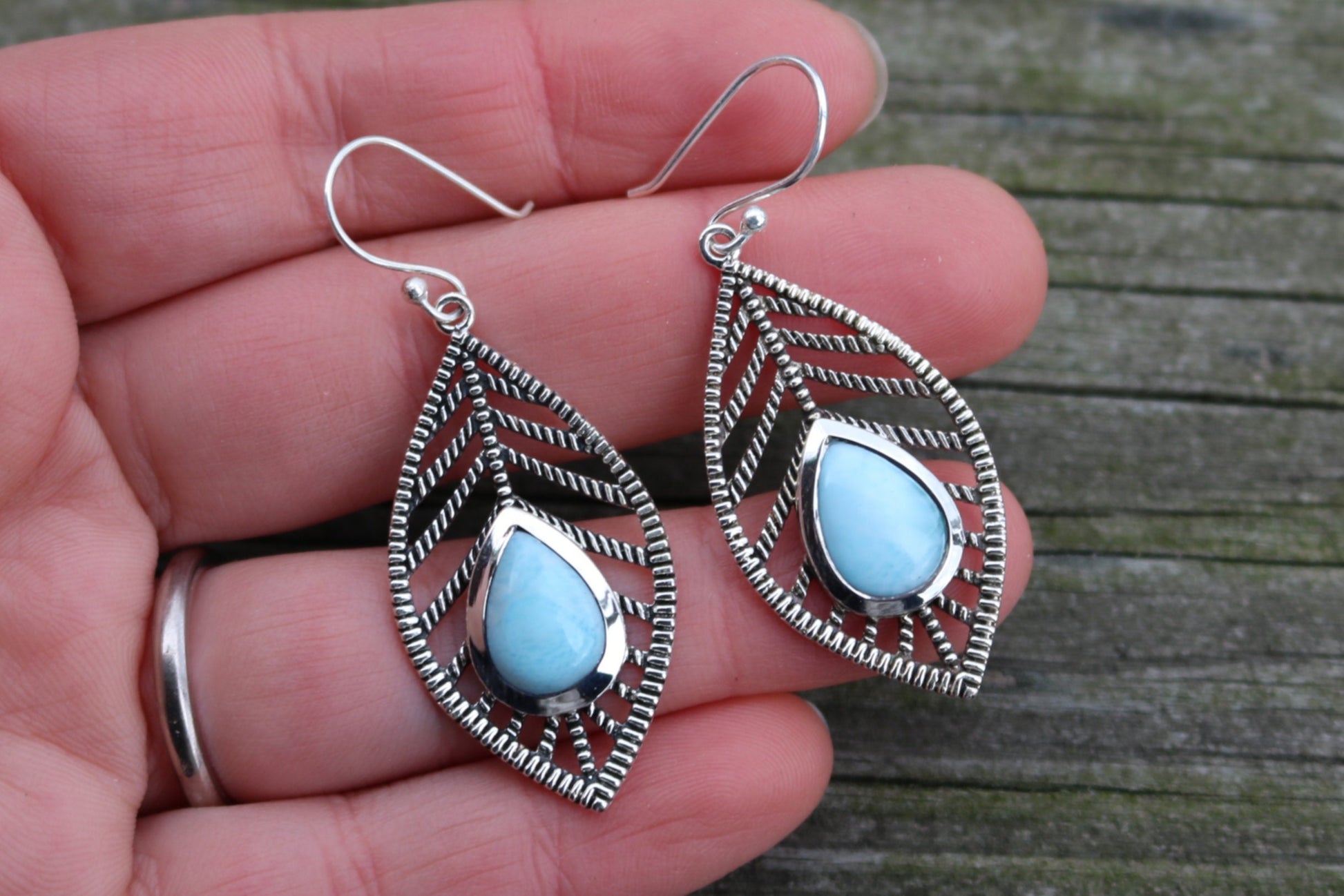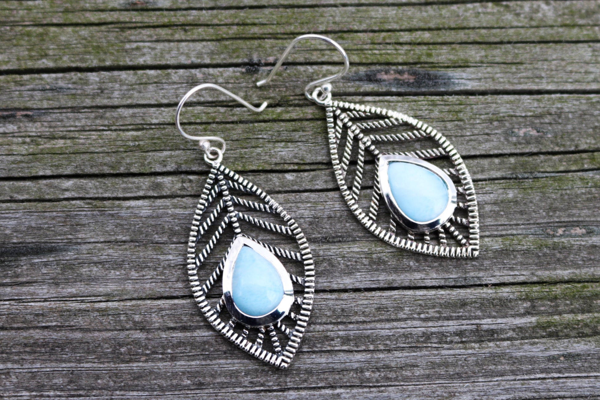 Larimar Earrings Leaf Dangling Ocean Summer Jewelry 2" 925 Silver